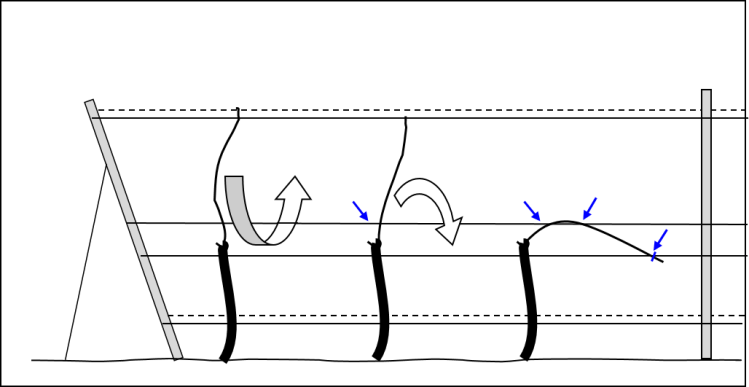 - Richtwert: Starke Stämme 5 Augen, Schwache Stämme 2 Augen –> Triebe später in Drahtrahmen fädeln